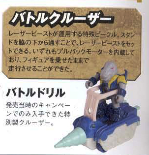 A special vehicle operated by the Laserbeasts. Set the Laserbeasts and stick the stand through the Laserbeasts armpits. All of them had a built-in pull back motor, which enabled them to drive the figure on board.