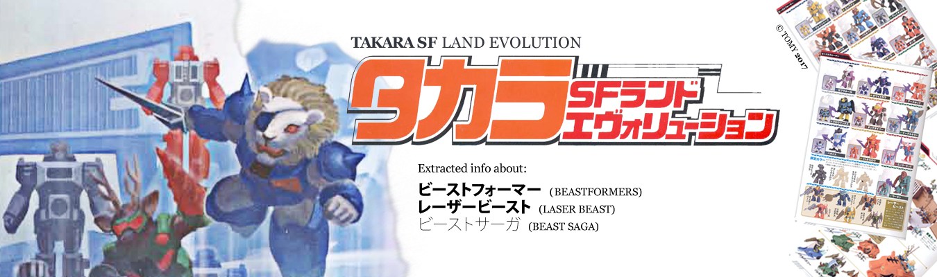 On Page 26 (part of the page shown on image left) within the Takara SF Land Evolution (2017) book the first ビーストフォーマー (Beastformers) content can be found, in total the book holds 8 pages (P26-P33) with info about this line. This includes a small segment of レーザービースト (Laser Beast) which can be found on page 31 and page 33.