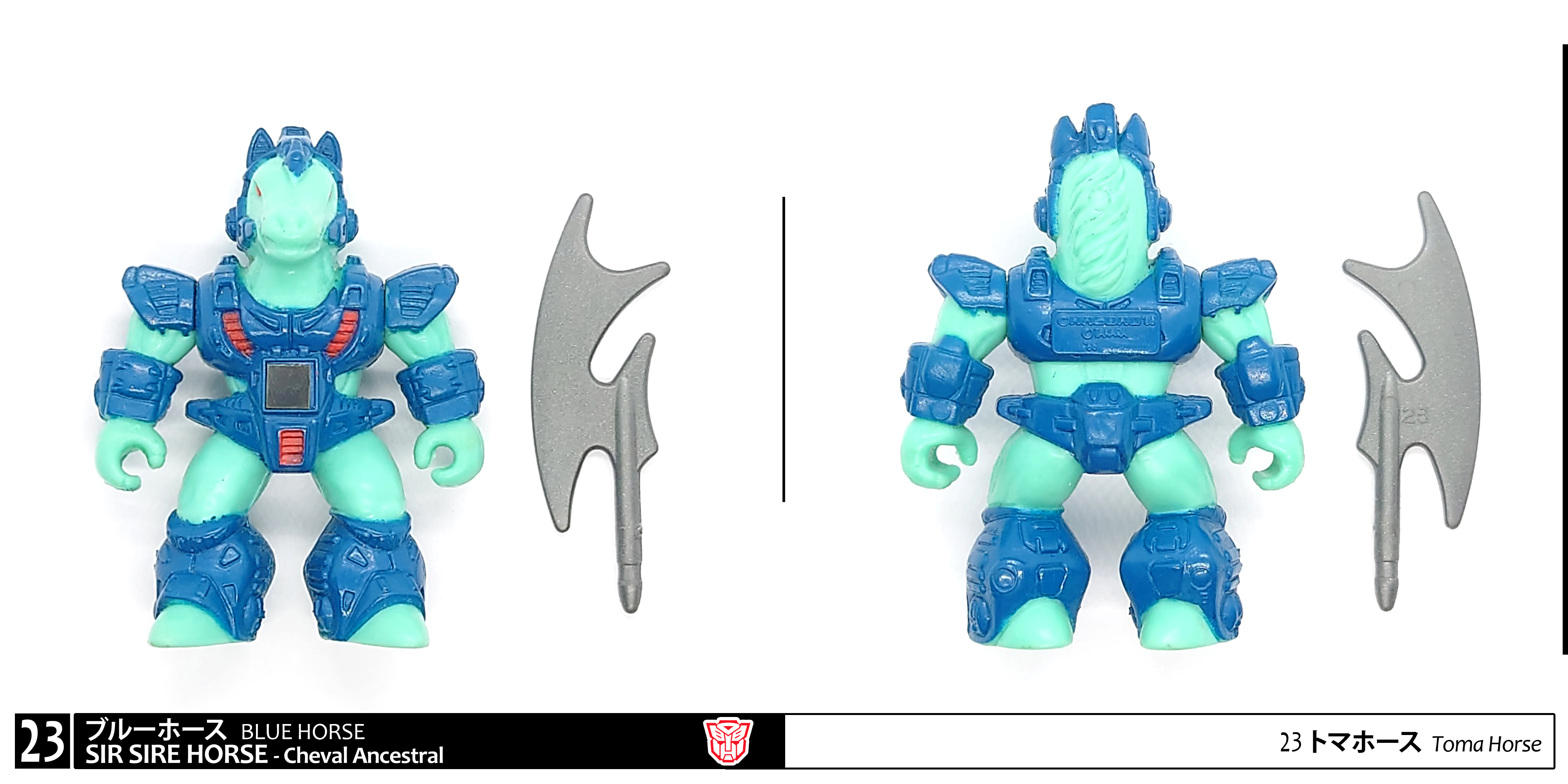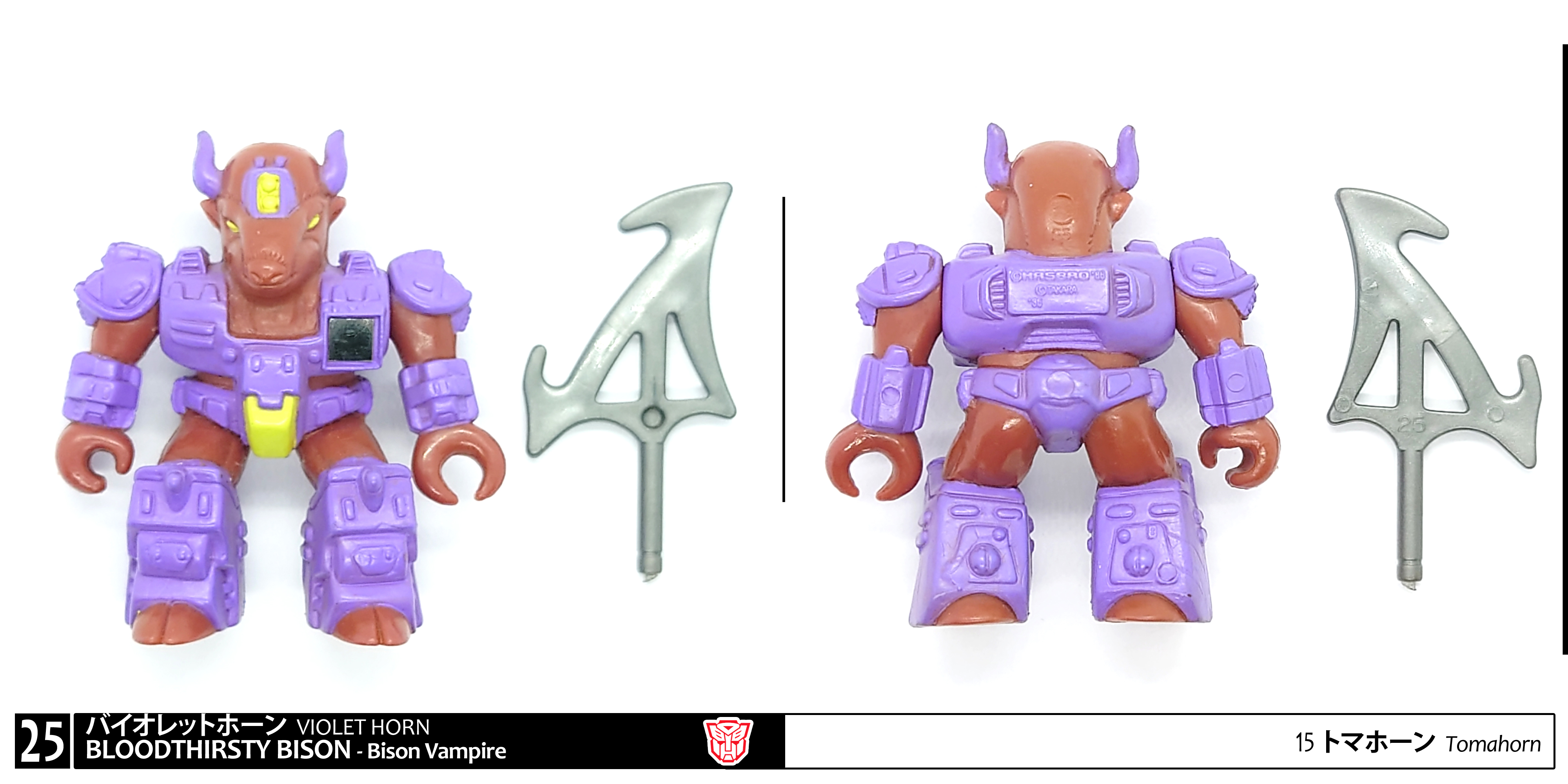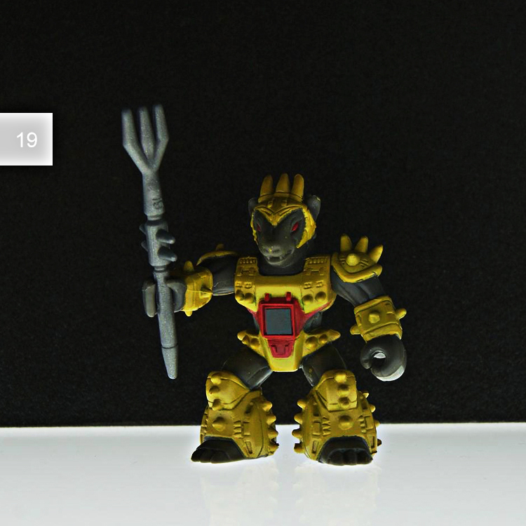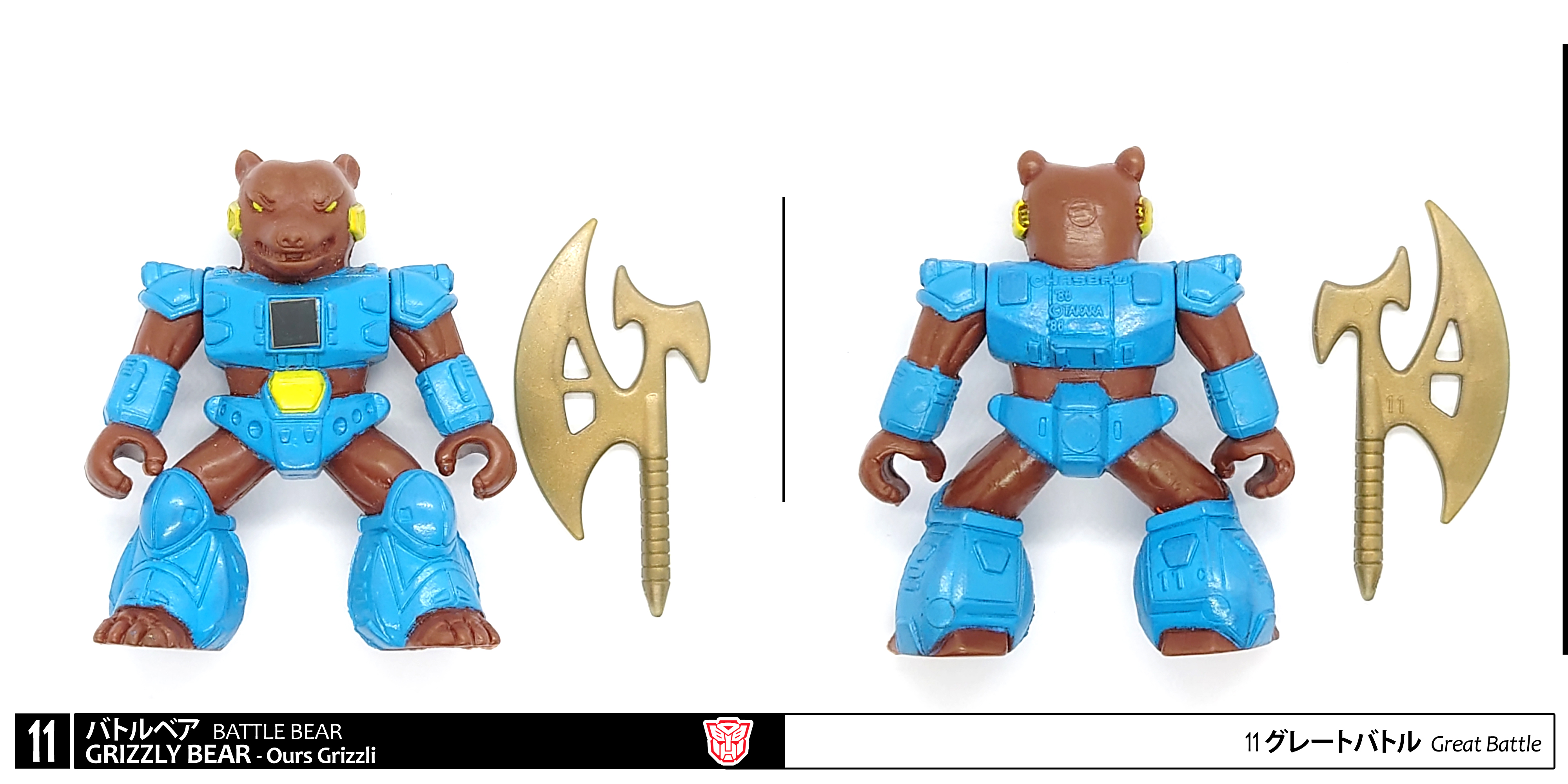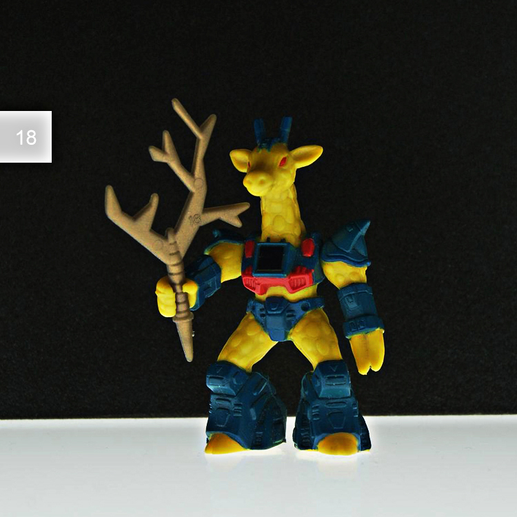 The First series of Battle Beasts was directly the most widespread one since they were available in Japan, Europe and North America during the ’80s. This series contained 28 figures (#1 – #28). On these series 1 figures the © Takara ’86 – © Hasbro ’86 mark can be found on the back of the figure as well as their number, which is also present on their weapon. In some European countries these first 28 figures were even produced in own factories resulting in the Spanish Bestias de Combate and the Greek Bootleg line Tepato Maxoi. In some cases a sticker [中国製] can be found on the bottom of one of the feet. This is referring to the fact of it being a genuine figure from Japan. It literally means; ”Made in China”, which seems a bit ironic but it makes more sense knowing all figures from the Japanese line were produced in China.