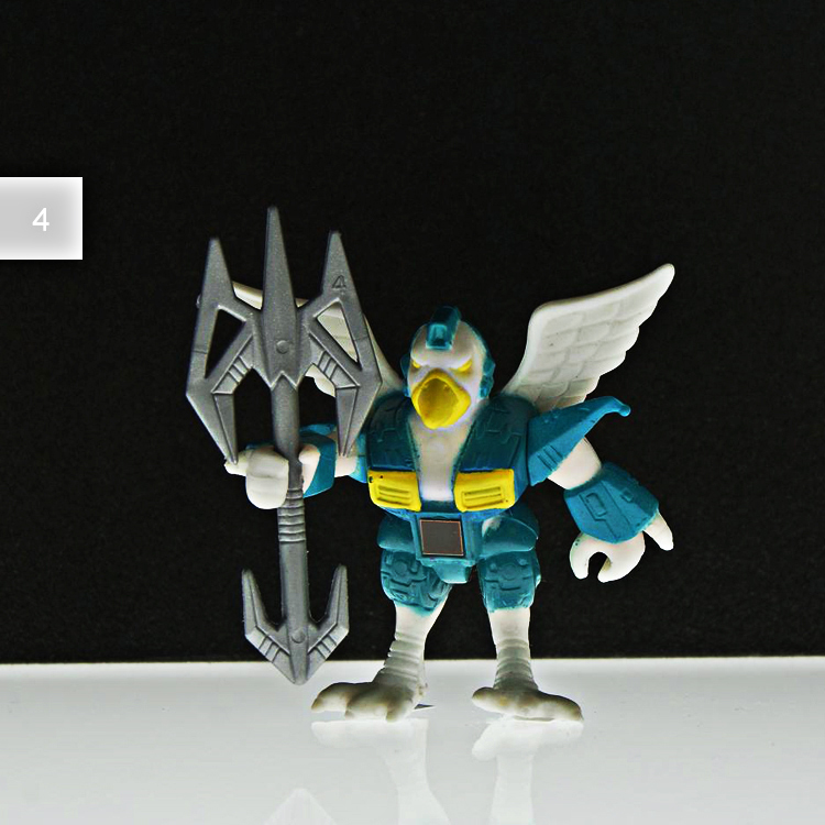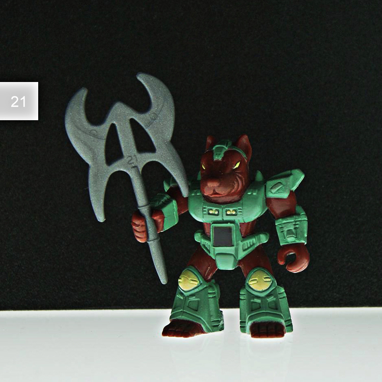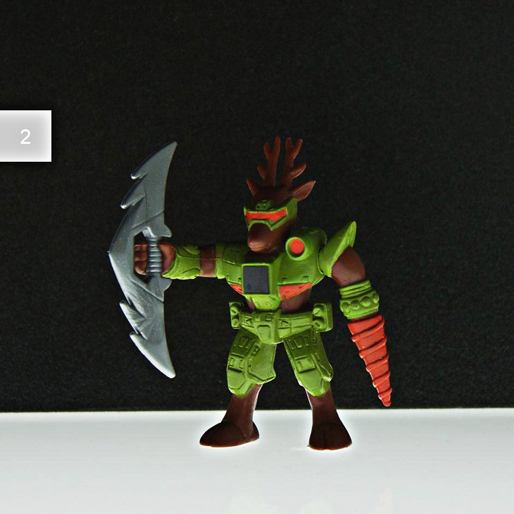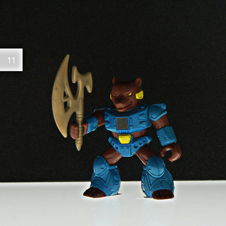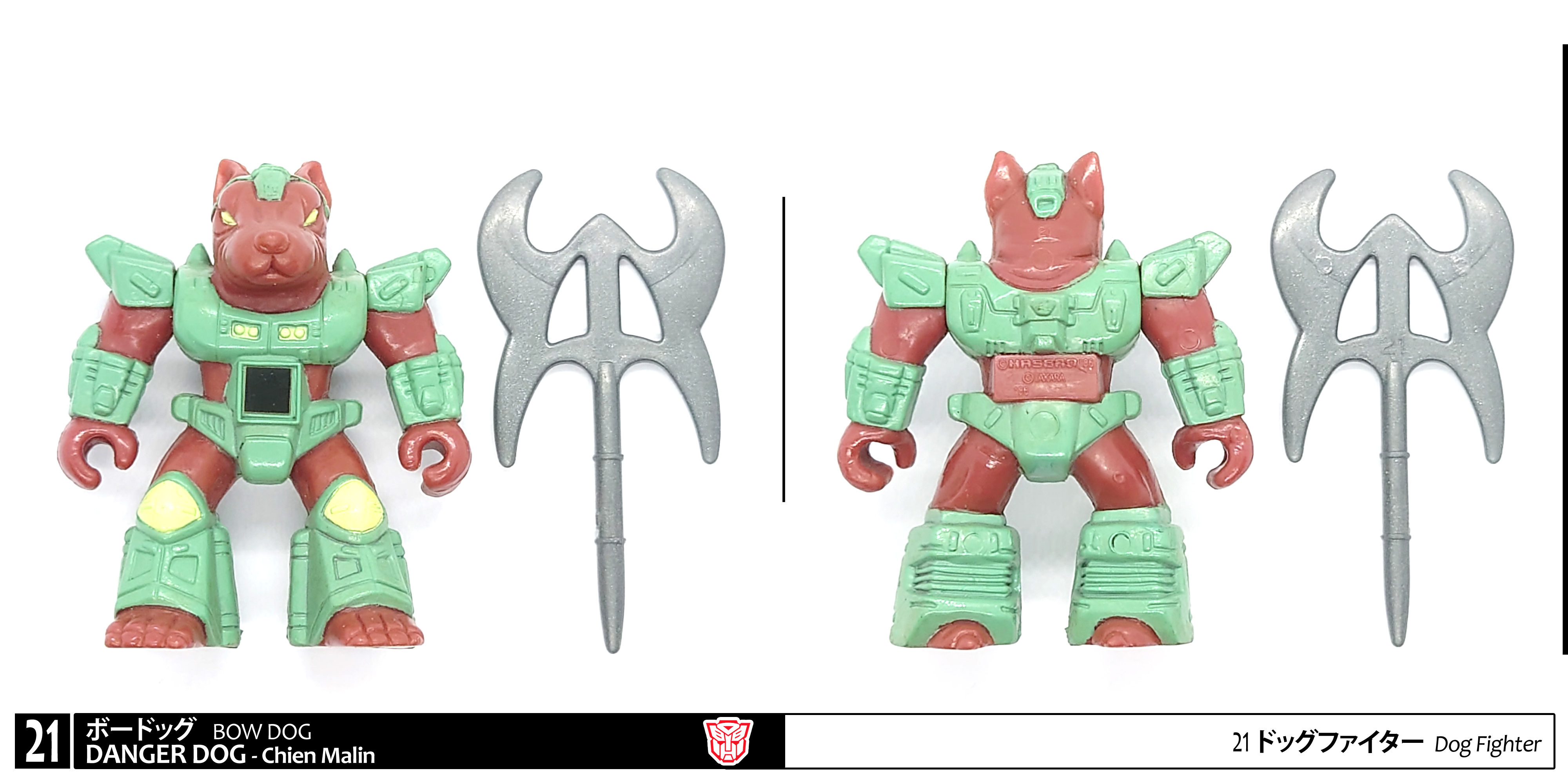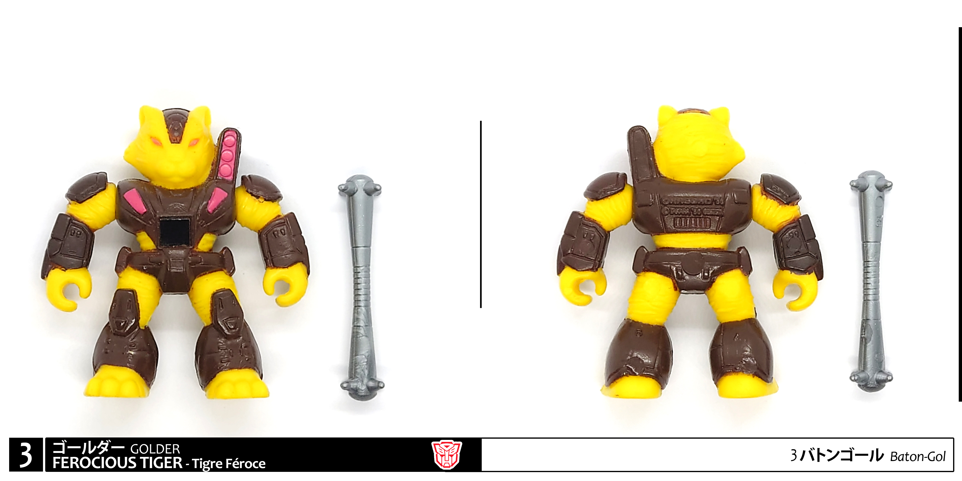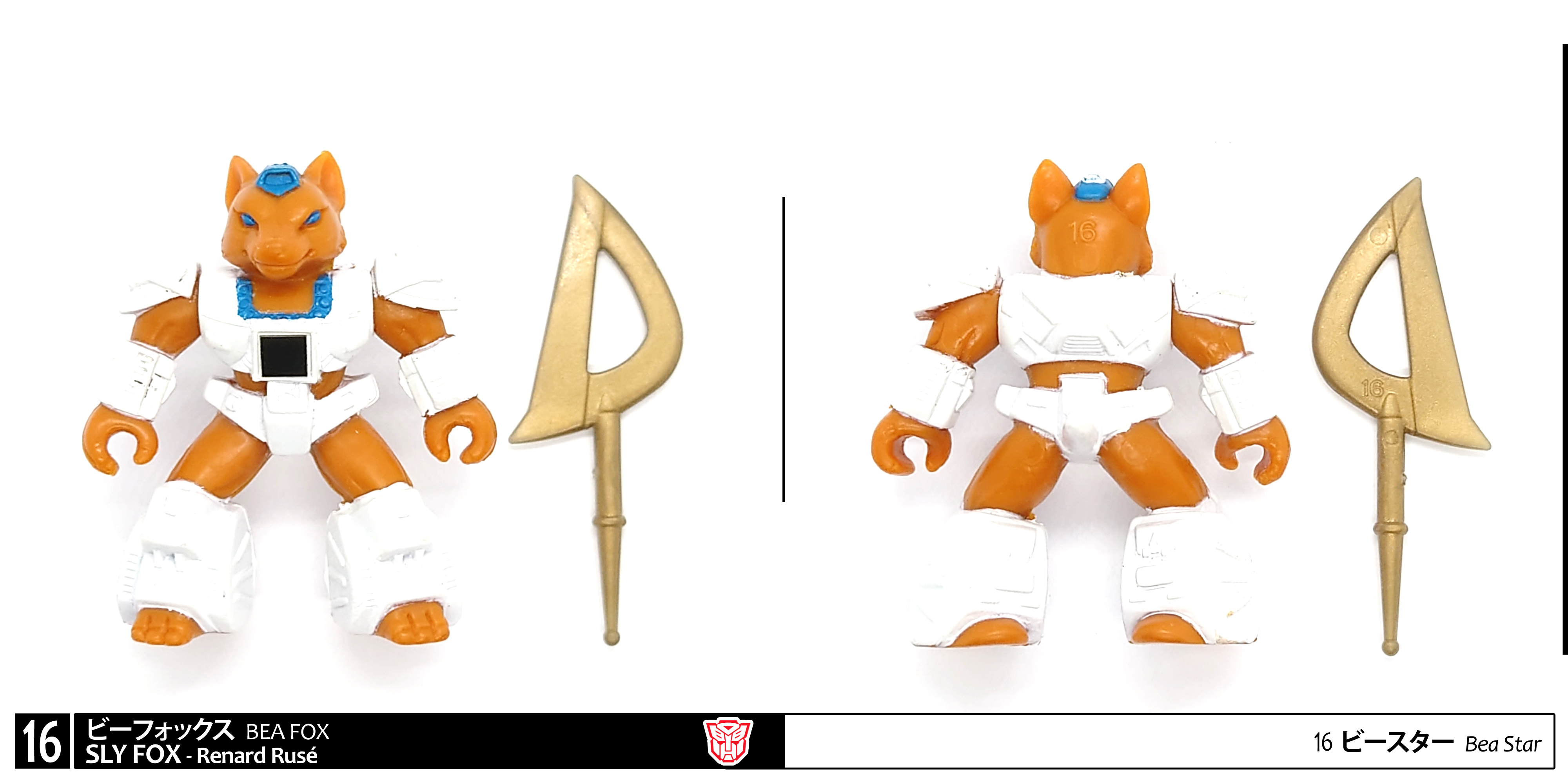 The First series of Battle Beasts was directly the most widespread one since they were available in Japan, Europe and North America during the ’80s. This series contained 28 figures (#1 – #28). On these series 1 figures the © Takara ’86 – © Hasbro ’86 mark can be found on the back of the figure as well as their number, which is also present on their weapon. In some European countries these first 28 figures were even produced in own factories resulting in the Spanish Bestias de Combate and the Greek Bootleg line Tepato Maxoi. In some cases a sticker [中国製] can be found on the bottom of one of the feet. This is referring to the fact of it being a genuine figure from Japan. It literally means; ”Made in China”, which seems a bit ironic but it makes more sense knowing all figures from the Japanese line were produced in China.