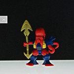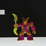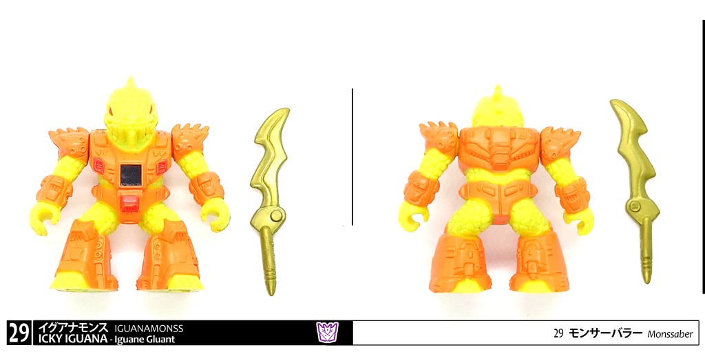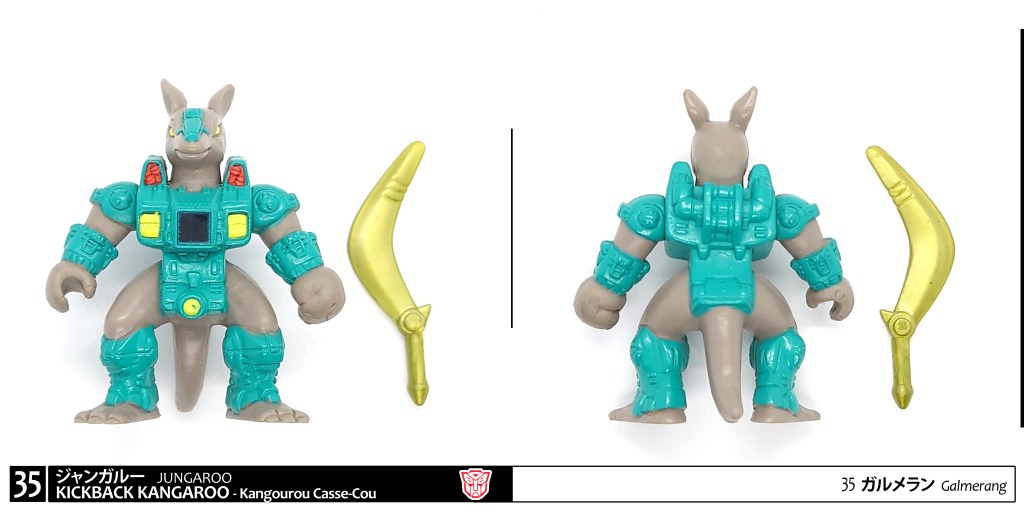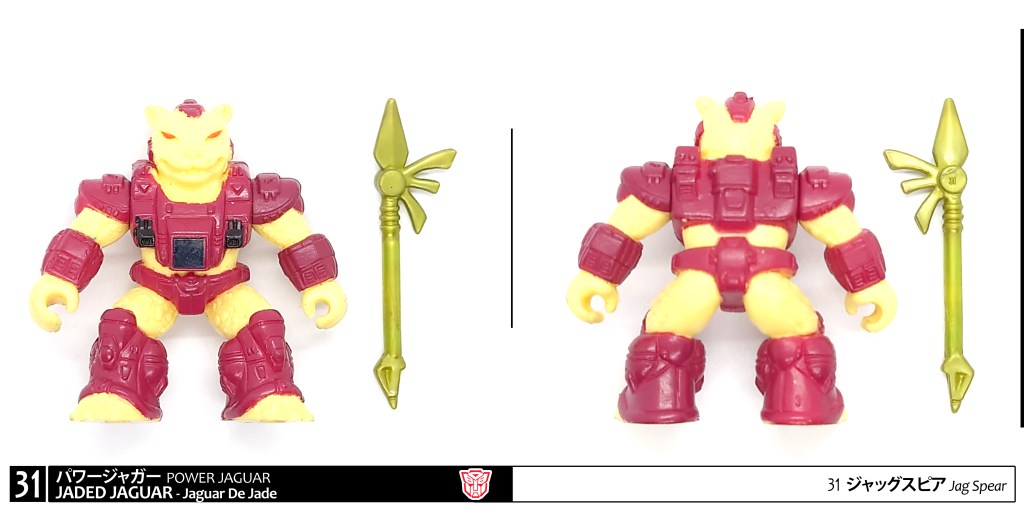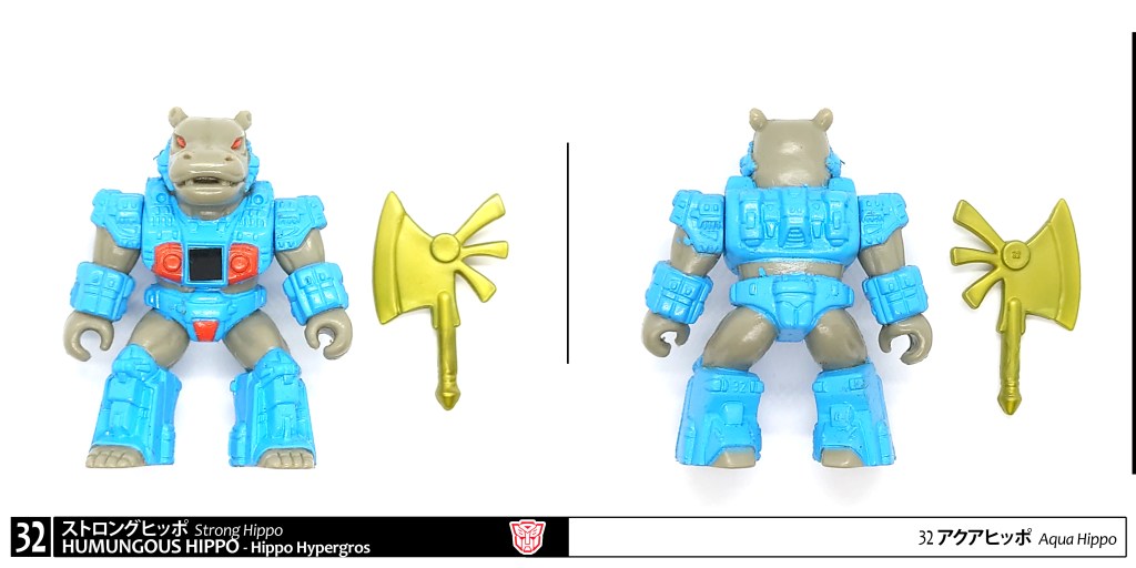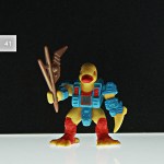 The Second series of Battle Beasts were only available in Japan and North America during the ’80s, Europe is mentioned within the Series 2 release as well but there is hardly any prove of this and by far the biggest amount of figs that do show up in Europe are Series 1. This series contained 24 figures (#29 – #52). On these series 2 figures the © Takara 1987 – © 1987 Hasbro mark can be found on the feet of the figure and their number is located on the back or head, which is also present on their weapon. It is possible you will also find another small number 2, 3 or a letter B, C on the back of the leg of this figure and this is referring to the production run in which this figure was made because in case a mold would break another one was produced to continue the production. With the Series 2 also the peg-hole in the bottom of the left foot showed up which was usefull to place the figure on some of the vehicles or playsets connected to this line. In some cases a sticker [中国製] can be found on the bottom of one of the feet. This is referring to the fact of it being a genuine figure from Japan. It literally means; ”Made in China”, which seems a bit ironic but it makes more sense knowing all figures from the Japanese line were produced in China.