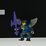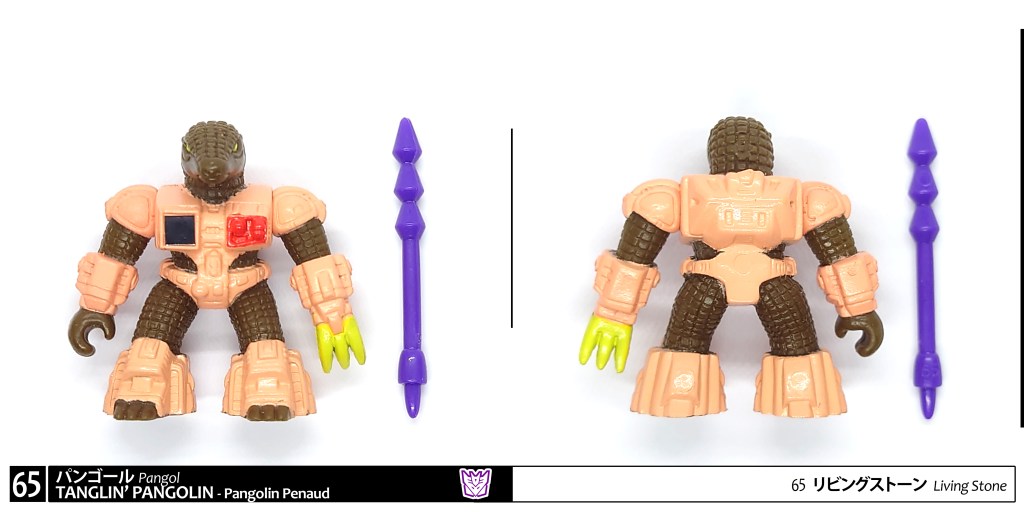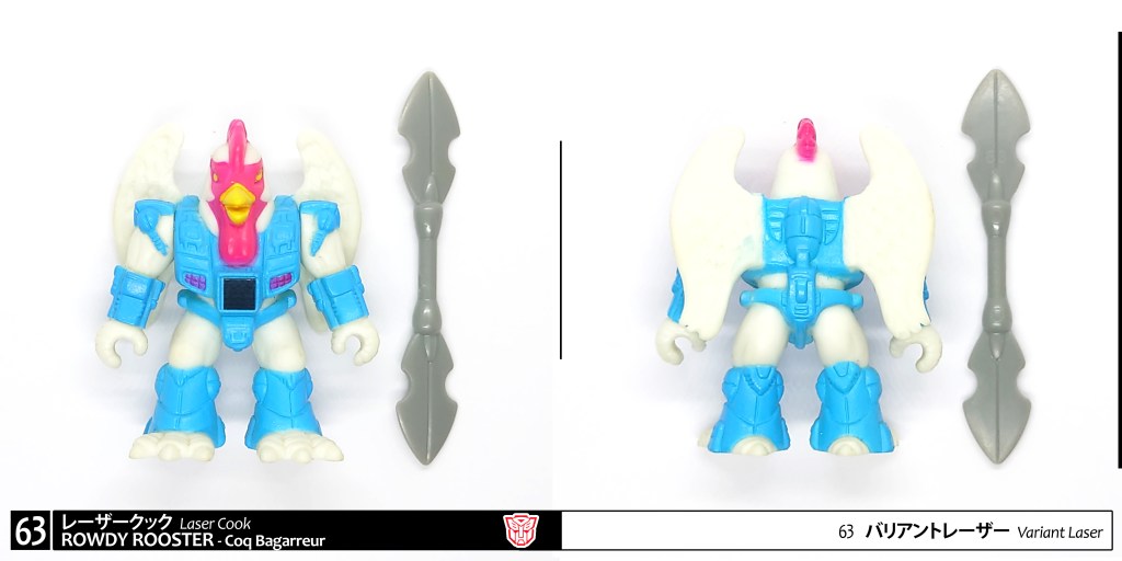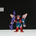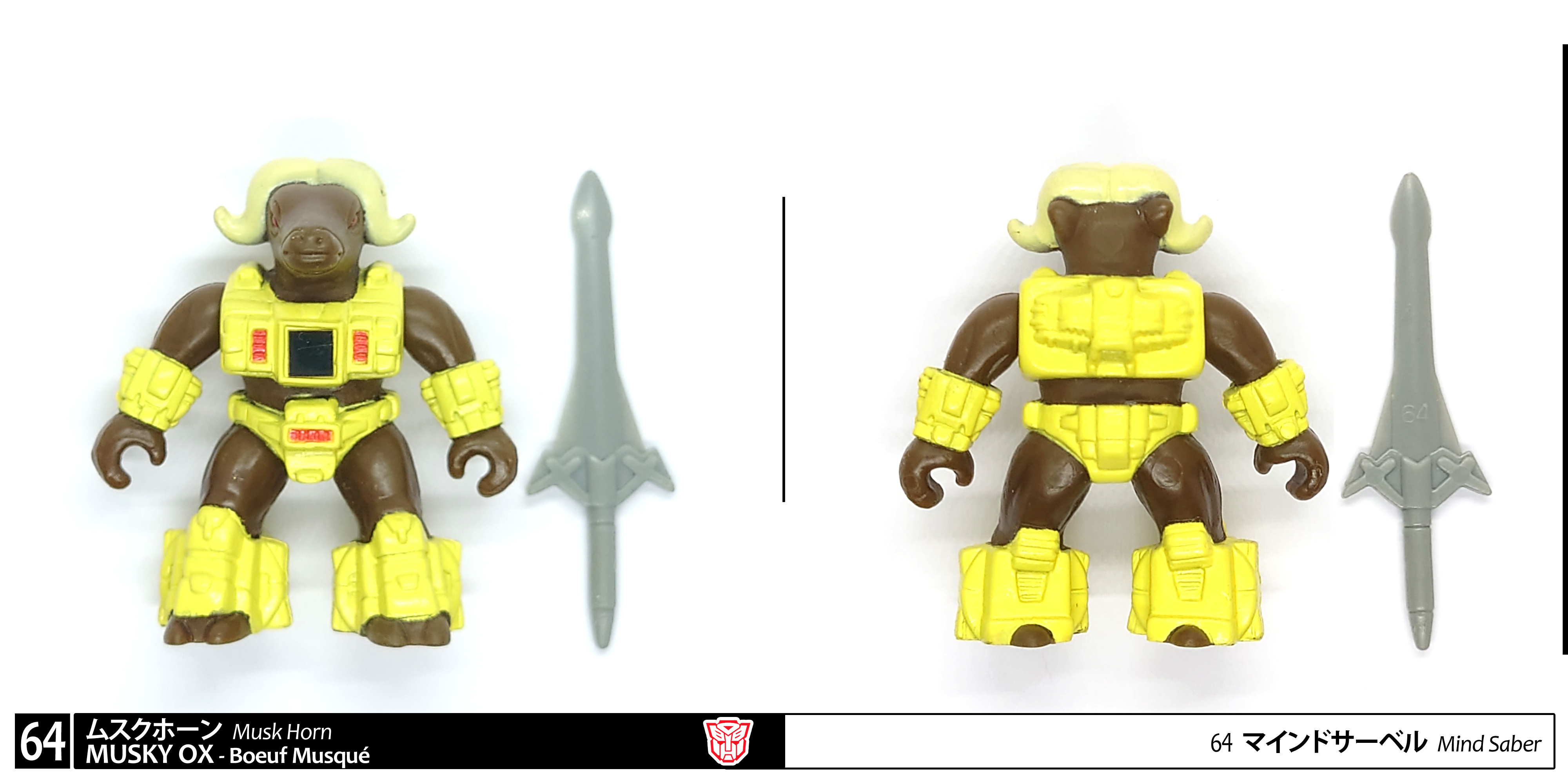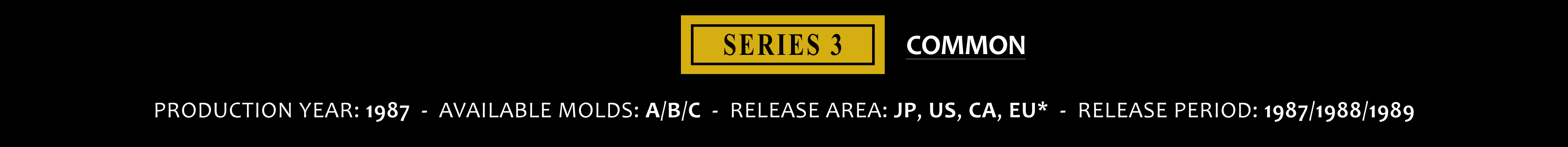 The Third and final series of Battle Beasts were only available in Japan and the US during the late ’80s. This series contained 24 figures (#53 – #76). On these Series 3 figures the © Takara 1987 – © 1987 Hasbro mark can be found on the feet of the figure and unlike the previous series also their number is located there, this number is also present on their weapon. It is possible you will also find a small letter A, B, C on the feet behind the number of this figure and this is referring to the production run in which this figure was made because in case a mold would break another one was produced to continue the production. Due to the fact that all markings and numbers have been placed on their feet this was the first series which holds figures with a back that is completely free of any marking. Like the Series 2 figures also the peg-hole in the bottom of the left foot can be found on these figures, this was usefull to place the figure on some of the vehicles or playsets connected to this line. In some cases a sticker [中国製] can be found on the bottom of one of the feet. This is referring to the fact of it being a genuine figure from Japan. It literally means; ”Made in China”, which seems a bit ironic but it makes more sense knowing all figures from the Japanese line were produced in China.