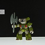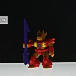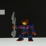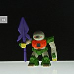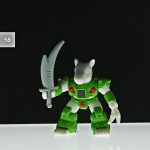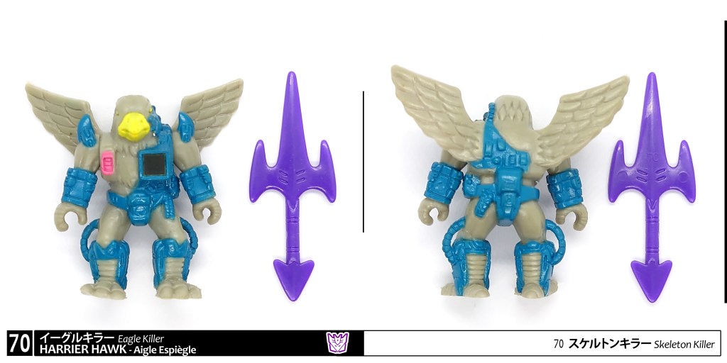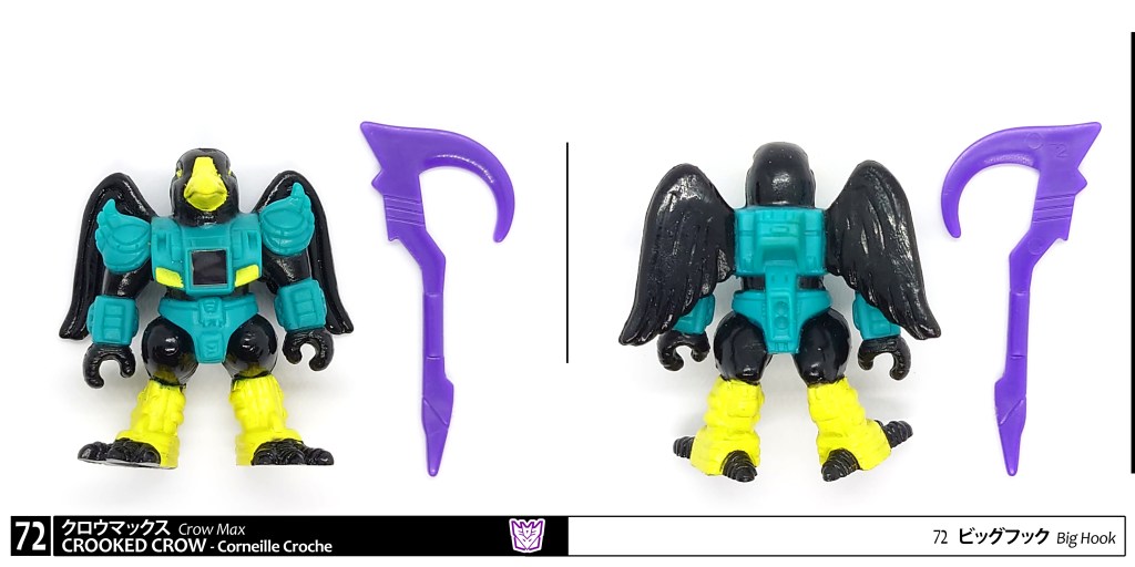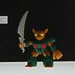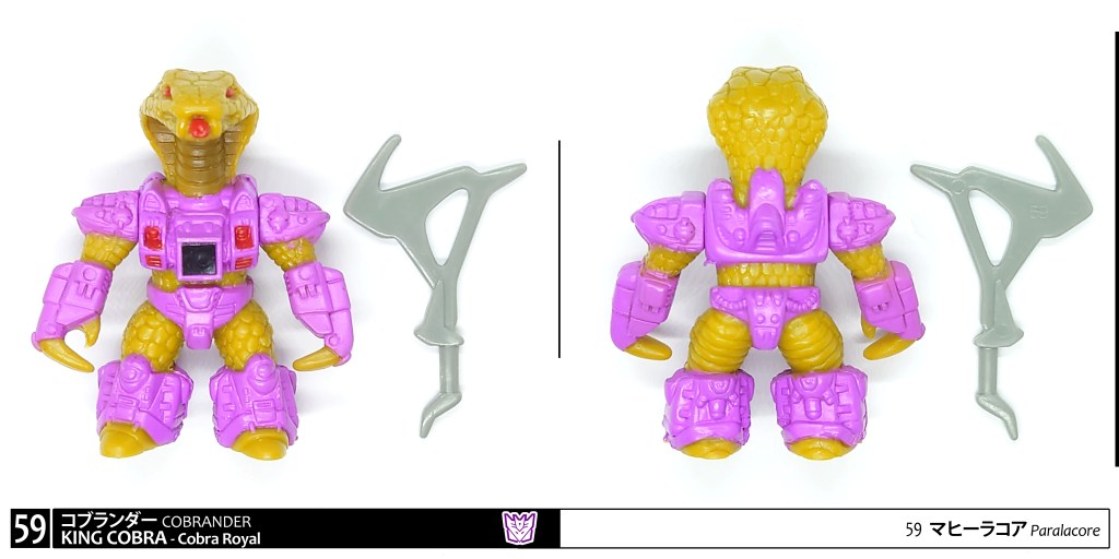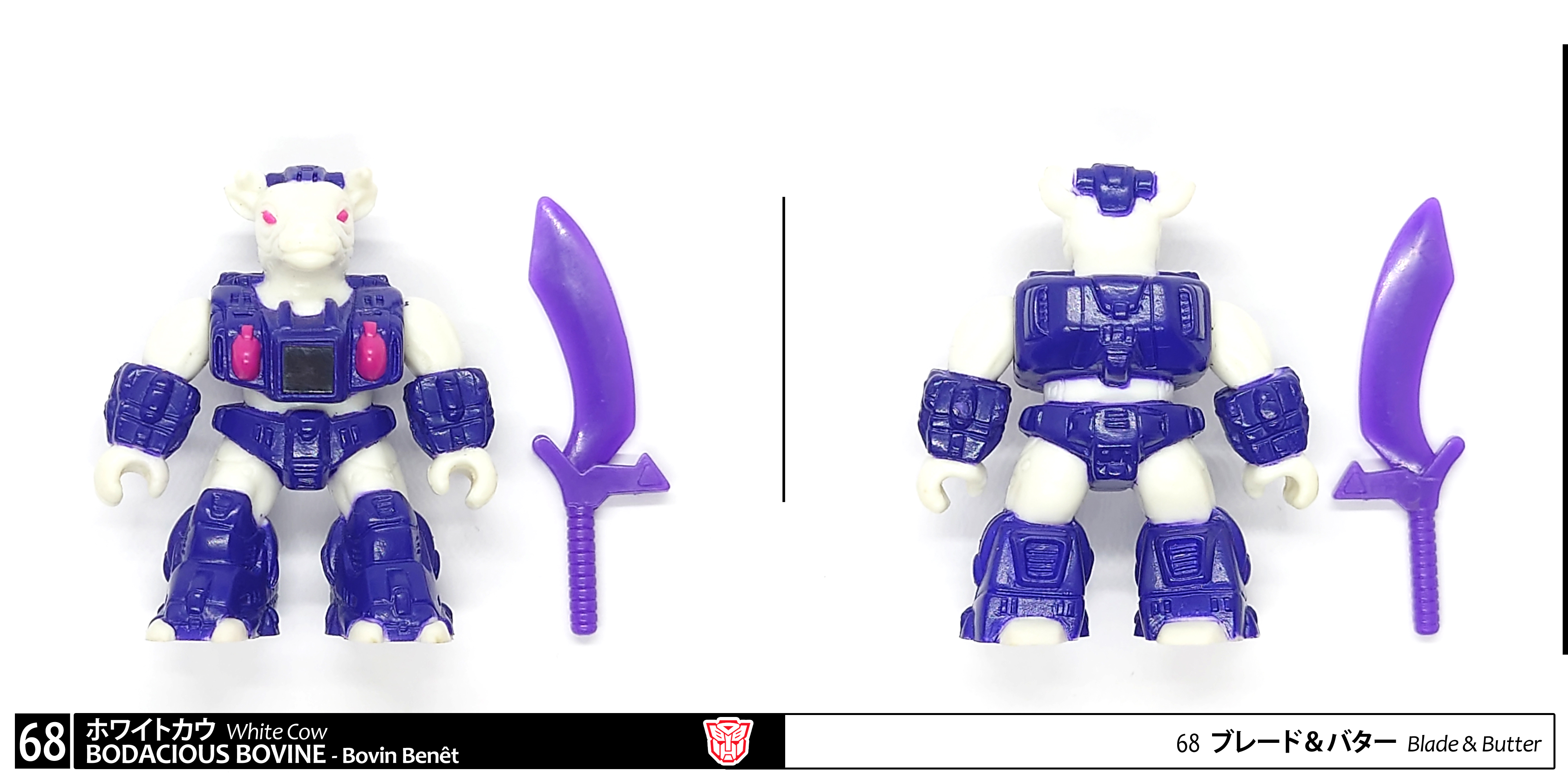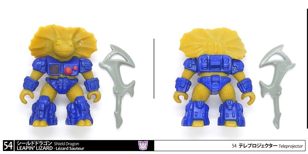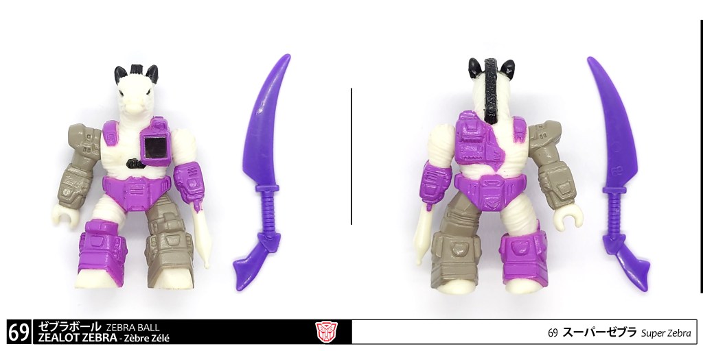 The Third and final series of Battle Beasts were only available in Japan and the US during the late ’80s. This series contained 24 figures (#53 – #76). On these Series 3 figures the © Takara 1987 – © 1987 Hasbro mark can be found on the feet of the figure and unlike the previous series also their number is located there, this number is also present on their weapon. It is possible you will also find a small letter A, B, C on the feet behind the number of this figure and this is referring to the production run in which this figure was made because in case a mold would break another one was produced to continue the production. Due to the fact that all markings and numbers have been placed on their feet this was the first series which holds figures with a back that is completely free of any marking. Like the Series 2 figures also the peg-hole in the bottom of the left foot can be found on these figures, this was usefull to place the figure on some of the vehicles or playsets connected to this line. In some cases a sticker [中国製] can be found on the bottom of one of the feet. This is referring to the fact of it being a genuine figure from Japan. It literally means; ”Made in China”, which seems a bit ironic but it makes more sense knowing all figures from the Japanese line were produced in China.