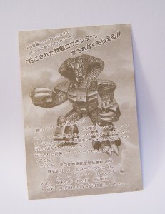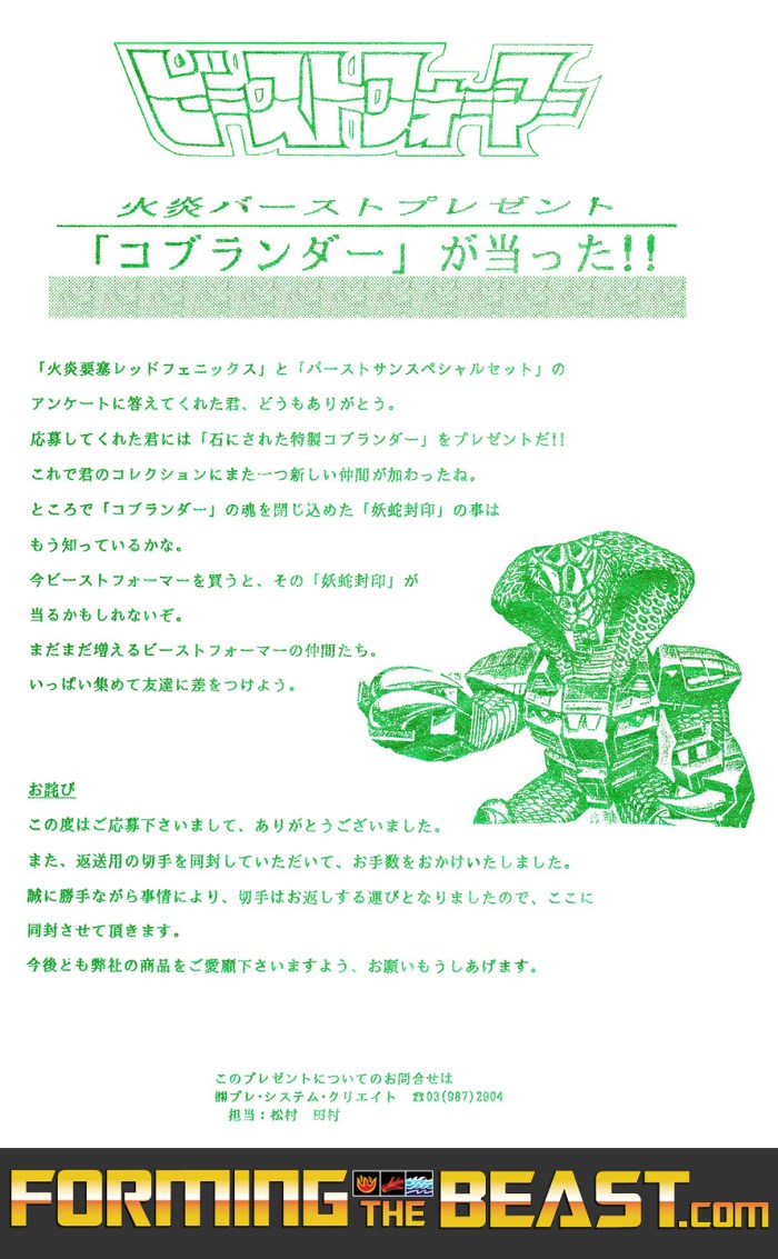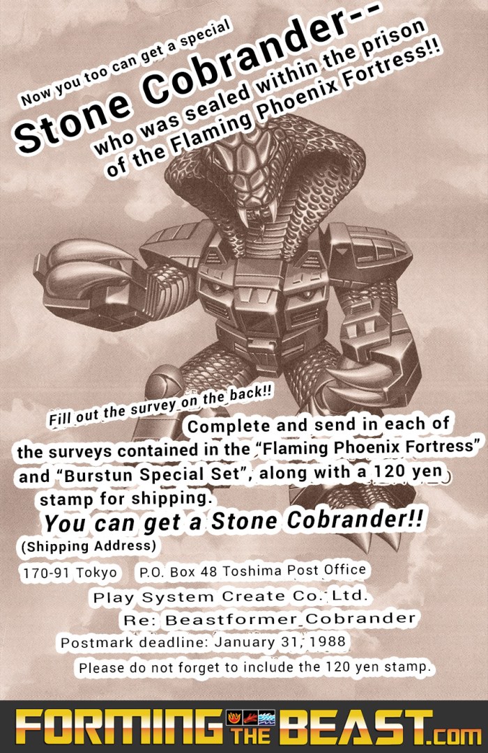 Although the little letter spoke for itself there are a few remarkable things that pop up. Of course it´s the apology for the troublesome process with including the stamp. Which back in the days wasn´t that abnormal with promotions held by companies. But it´s clear that something changed along the line on the TAKARA side meaning you did indeed get a completely FREE Mail-Away exclusive Beastformer; Stone Cobra. Otherwise it´d still have been a great score at only the price of a stamp (120円).