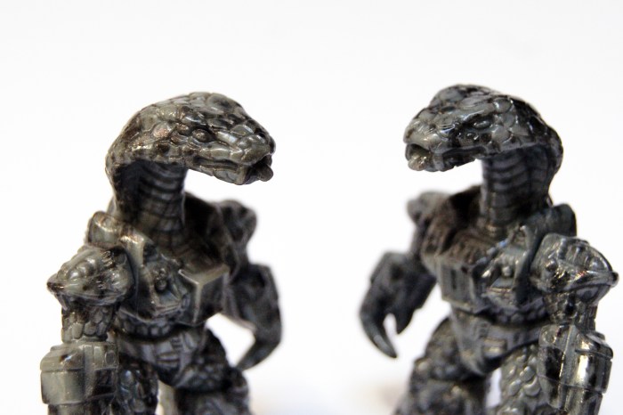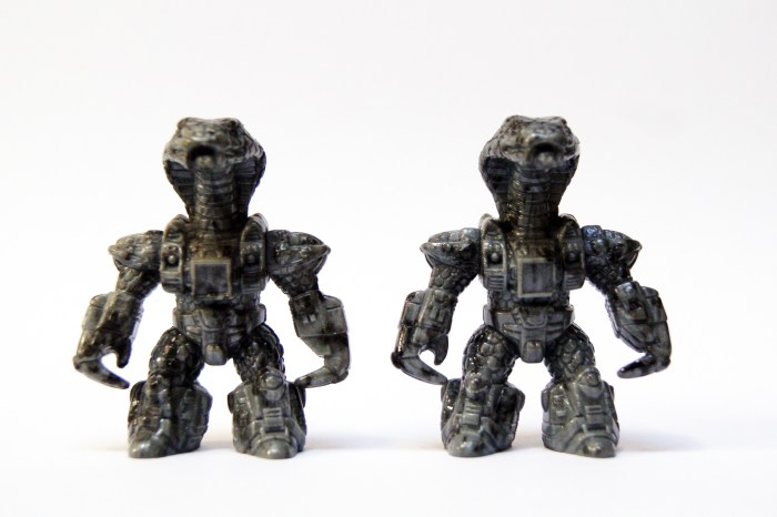 One of the nice things about this premium Battle Beast is that each figure is a unique piece on its own based on the way how the marbling effect has been applied onto the figure. In the base the Stone Cobra is cast in the mold of the regular King Cobra, hence the reason you can also find Stone Cobra´s with the letters A,B or C underneath their feet. But it´s molded in a different base color namely grey instead of brown (like the original figure) and on top of this grey base a marbling effect has been applied by dipping it into a ¨bath¨ which has a film layer of special paint on top of it. If you want to know more about this process have a look at the term: Hydro Dipping. This process results in the fact that after the figure has been pulled out, it´s not completely submerged so the bottom of your Stone Cobra will always show the plain grey from the base color, a unique marbling pattern is covering the figure. Unique because the way how this film layer attaches to the figure in combination with the movement is impossible to repeat in the exact same way. Making each Stone Cobra unique.