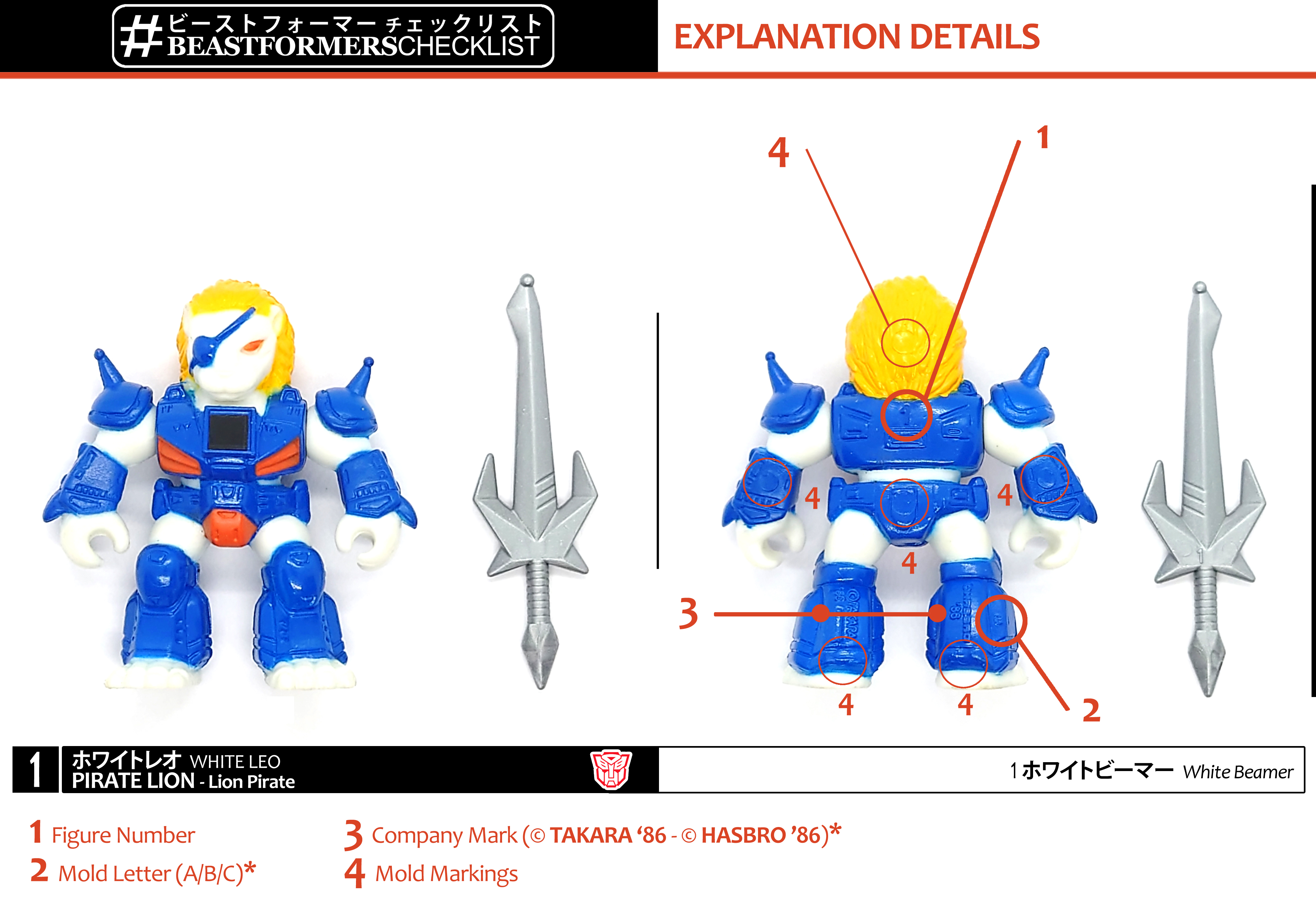 *At this moment in time the actual meaning of the Mold Letter in relation to the production process back in the days is still a bit unclear. Was B the follow up of A which had worn out and is C the follow up of B, or did each mean mold hold 3 positions and these letters simply confirmed which position each figure had in the mold. Keep in mind that the figures were produced in so called Mold Pairs, so within EACH Series you will always find at least 2 figures with the exact same base color. Pirate Lion for instance is a Mold Partner with Colonel Bird. Both Beasts have a White base color, sometimes due to the applied paint job things might be a bit less obvious but this goes for ALL Battle Beasts (BB) and Laser Beasts (LB)!