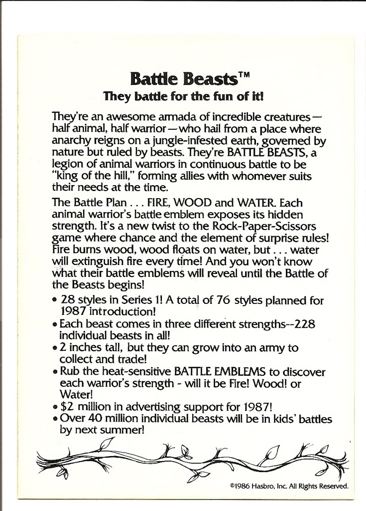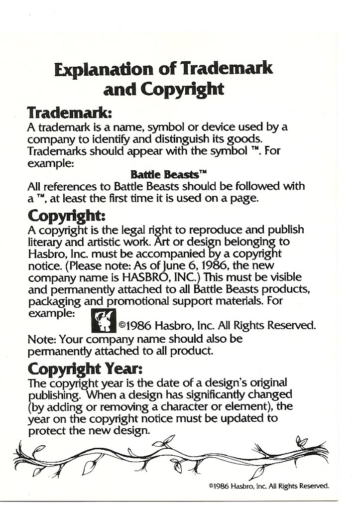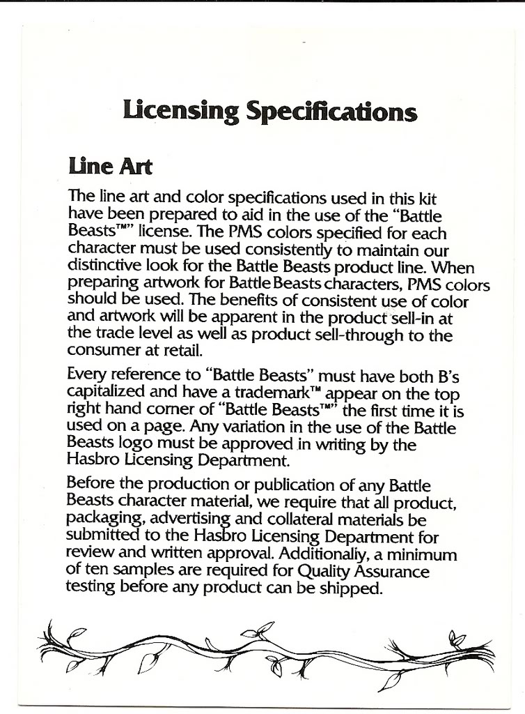 In order to keep control over the companies that were provided with a license related to the Battle Beasts line HASBRO´s Licensing Department created a kit which clearly described the art and color specifications that had to be used for the figures as well as some clear instructions concerning the use of the Battle Beasts Trademark TM and of course their own Hasbro Logo with Copyright info. This Line Art kit held the ground rules regarding every Battle Beasts publication or product under to the license of Hasbro back in the 80´s.
