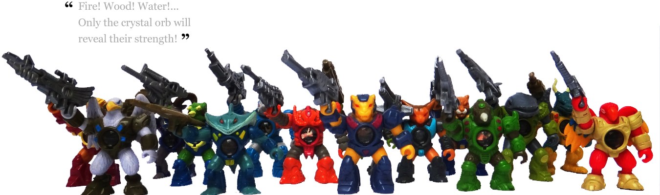 The Laser Beasts were not equipped with the rub-sign anymore but they had another element called the orb. A light-admitting cylindrical piece of plastic on which the symbol (water, wood, fire) became visible when it was held in front of a light source. Thanks to this more sustainable solution most of the Laser Beasts or Shadow Warriors found today are still showing their original symbol whereas some of the Battle Beasts have lost their sticker and are living with a bare chest. Due to that the Laser Beasts can be seen as the updated version of the old Battle Beasts.