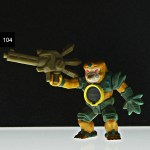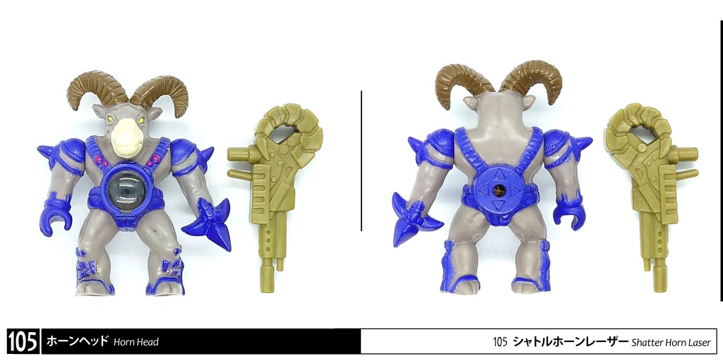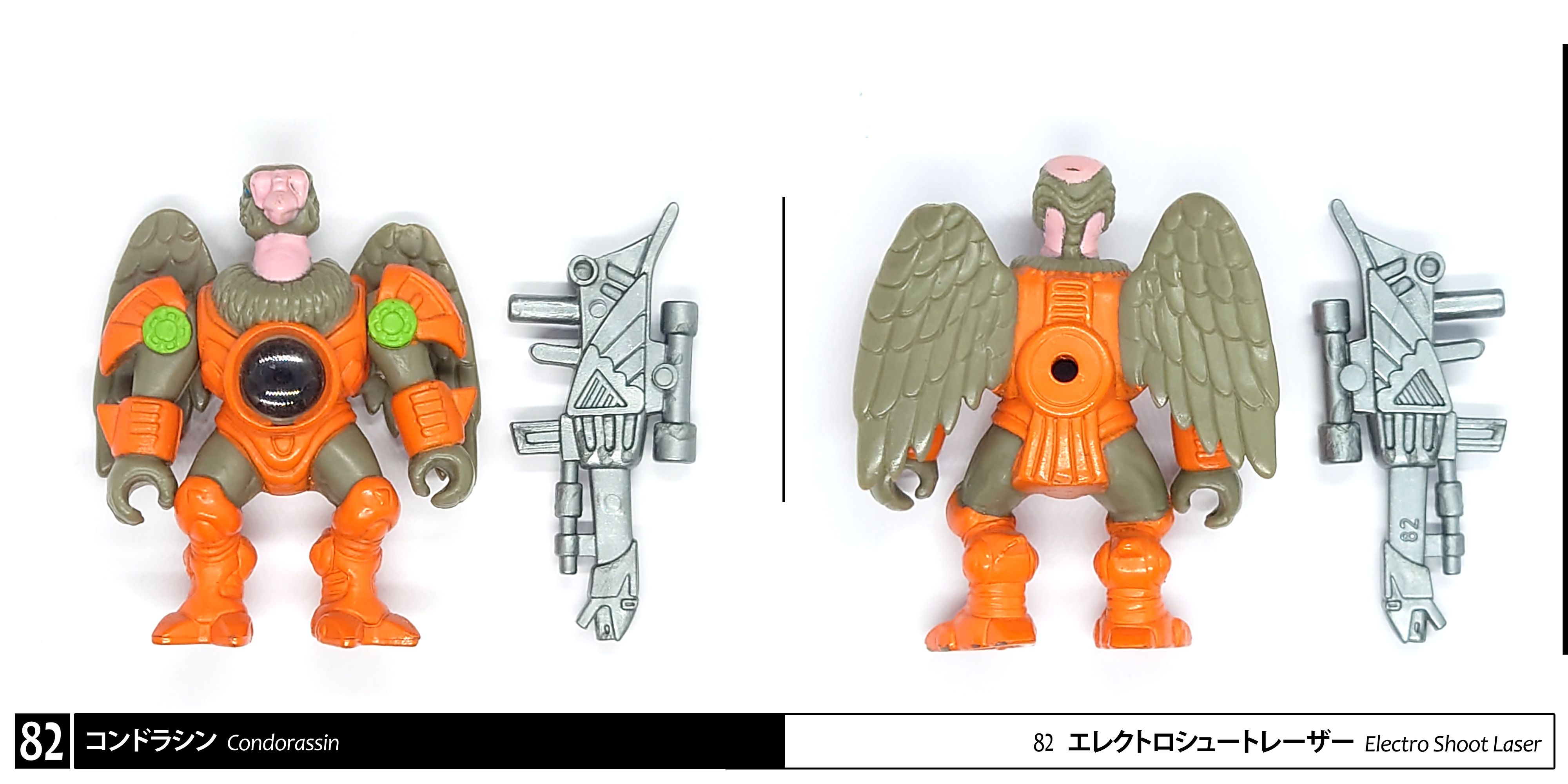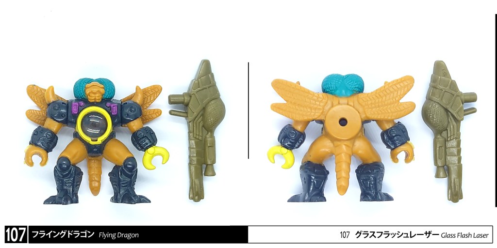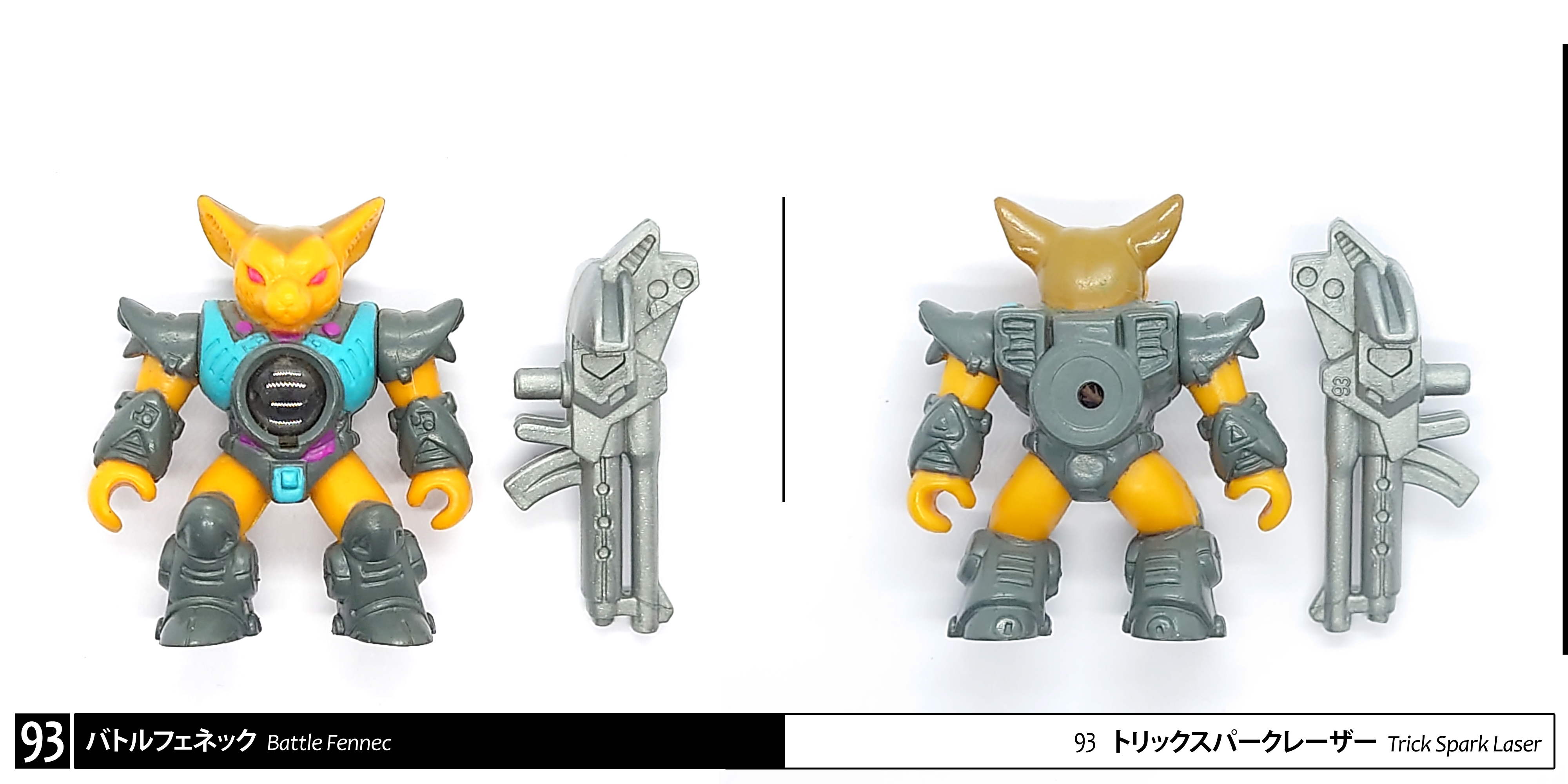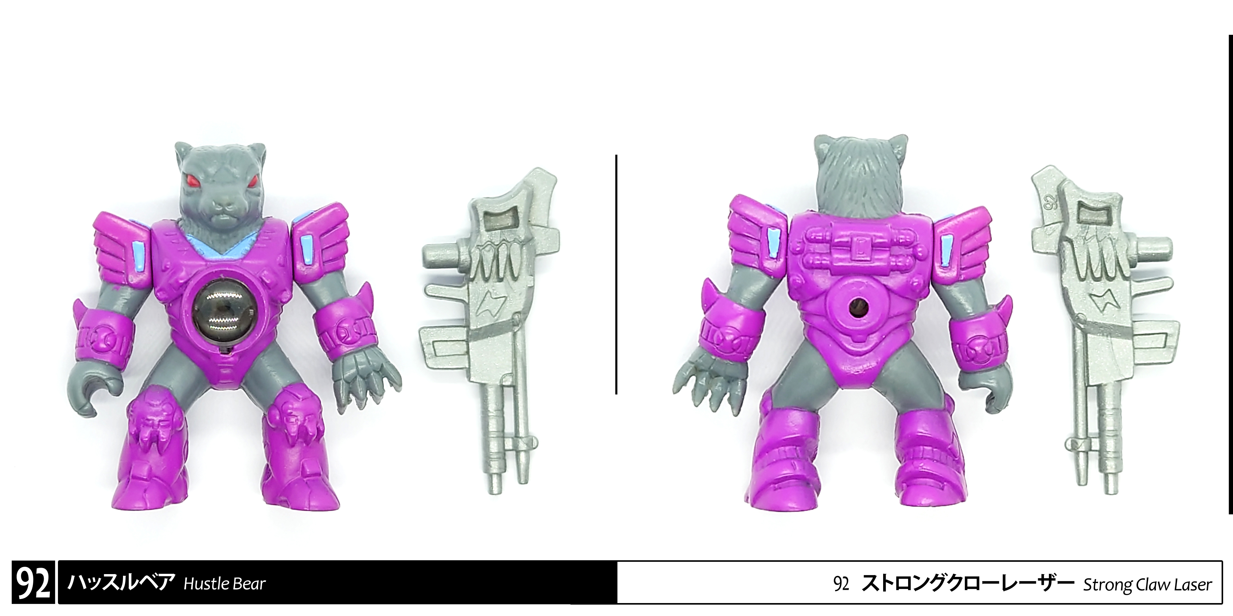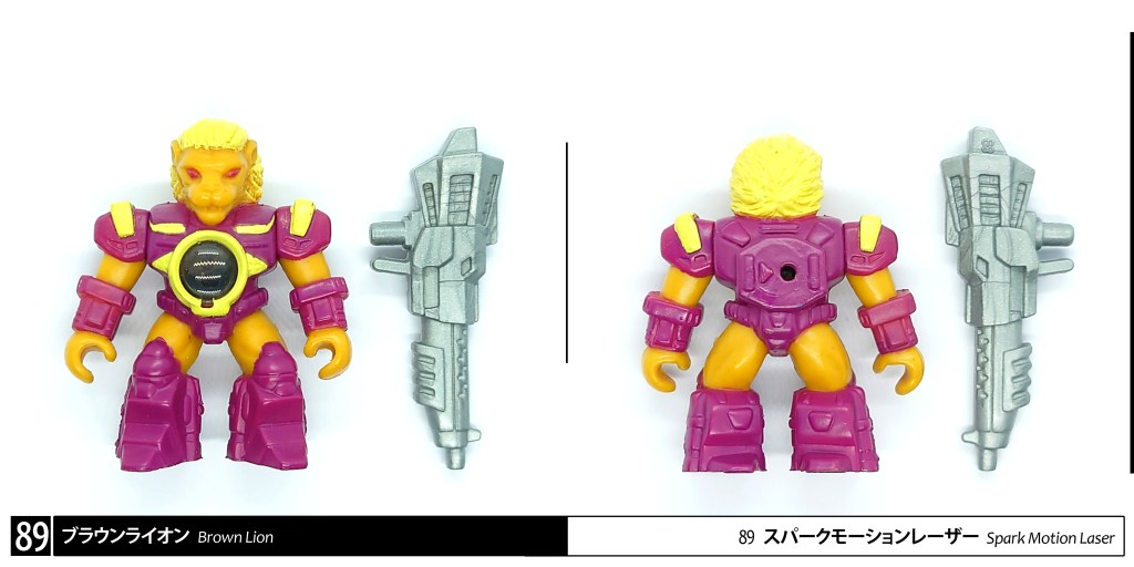 The Fourth series of Battle Beasts got another name due a change in design they became the so called Laser Beasts or Shadow Warriors. A complete series was only available in Japan during the late ’80s. This series contained 36 figures (#77 – #112). To describe the release and rareness of these figures the best way it is the easiest to cut the 36 figures in 3 parts knowing the lower 12 (#77 – #88), the middle 12 (#89 – #100) and the so called 12 high end figures (#101 – #112). The lower 12 were the most widespread of this line because outside Japan they were available in North America and a few European countries. Outside Japan, France was the only other country in the world to welcome the middle 12 figures. Remaining only the last 12 figures that can be seen as Japanese exclusives knowing they were only available in their land of origin, Japan. On these Serie 4 figures the first twelve were marked © Takara 1987 – © 1987 Hasbro  © while the other 24 had the © Takara 1988 – © 1988 Hasbro mark can on their feet, and like the Serie 3 figures also their number is located there which also showed on their weapon. It is possible you will also find a small letter A, B, C on the feet after the number of this figure and this is referring to the production run in which this figure was made because in case a mold would break another one was produced to continue the production. Like the Series 2 and 3 figures also the peg-hole in the bottom of the left foot can be found on the Series 3 figures this was useful to place the figure on some of the vehicles or playsets connected to this line, in this particular case it were the Battle Sleds. In some cases a sticker [中国製] can be found on the bottom of one of the feet. This is referring to the fact of it being a genuine figure from Japan. It literally means; ”Made in China”, which seems a bit ironic but it makes more sense knowing all figures from the Japanese line were produced in China.