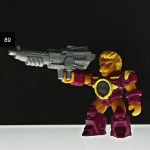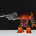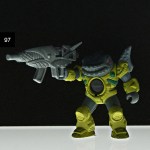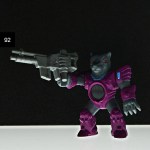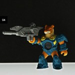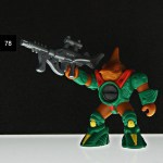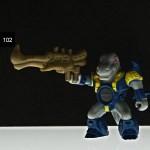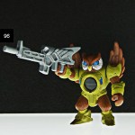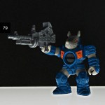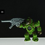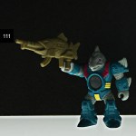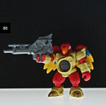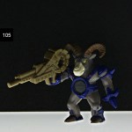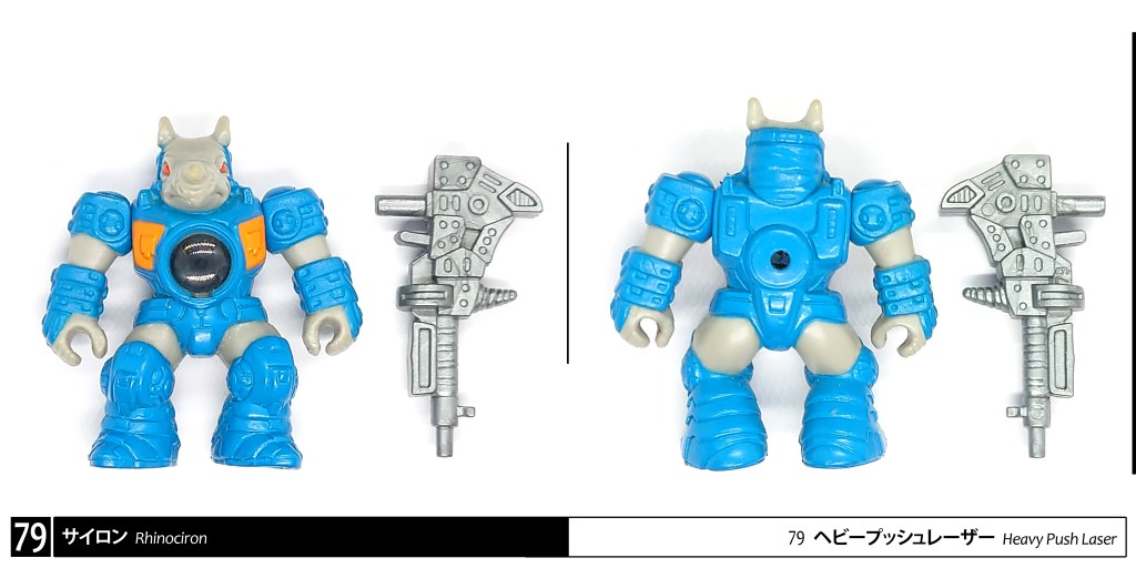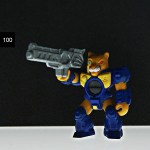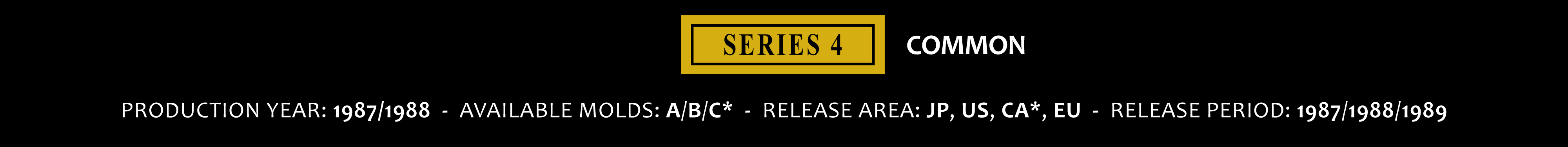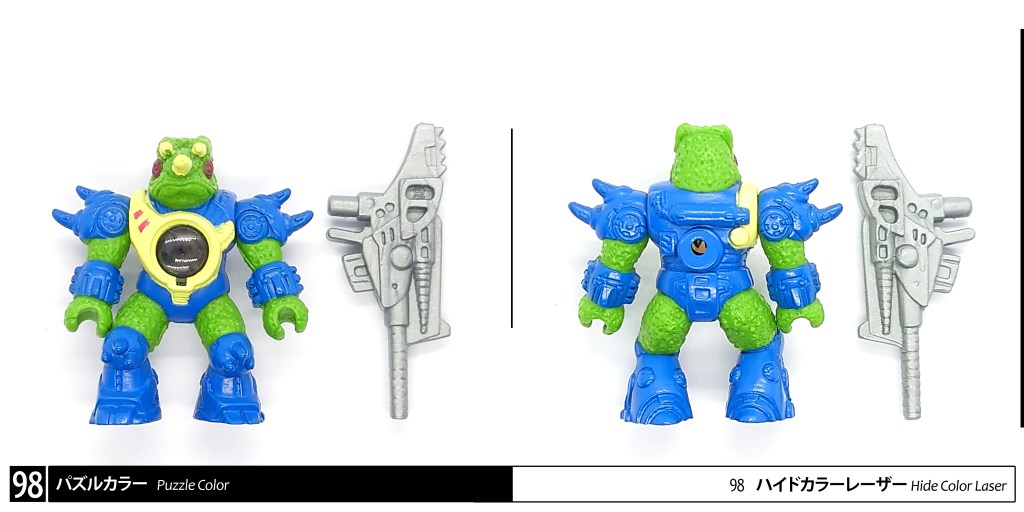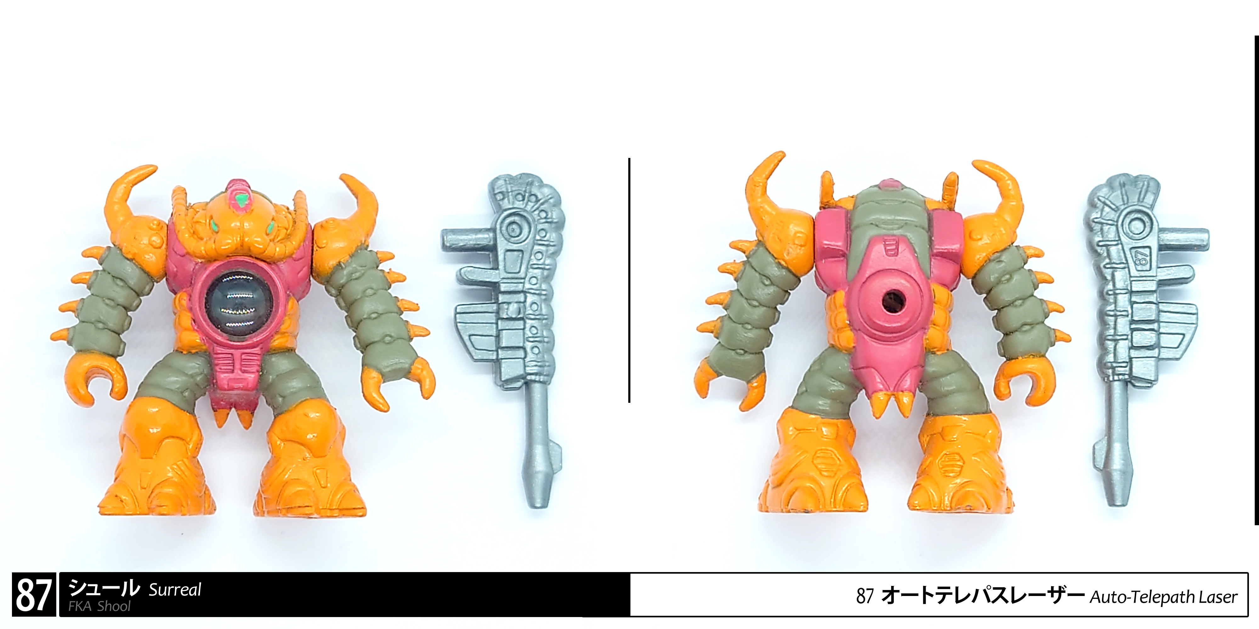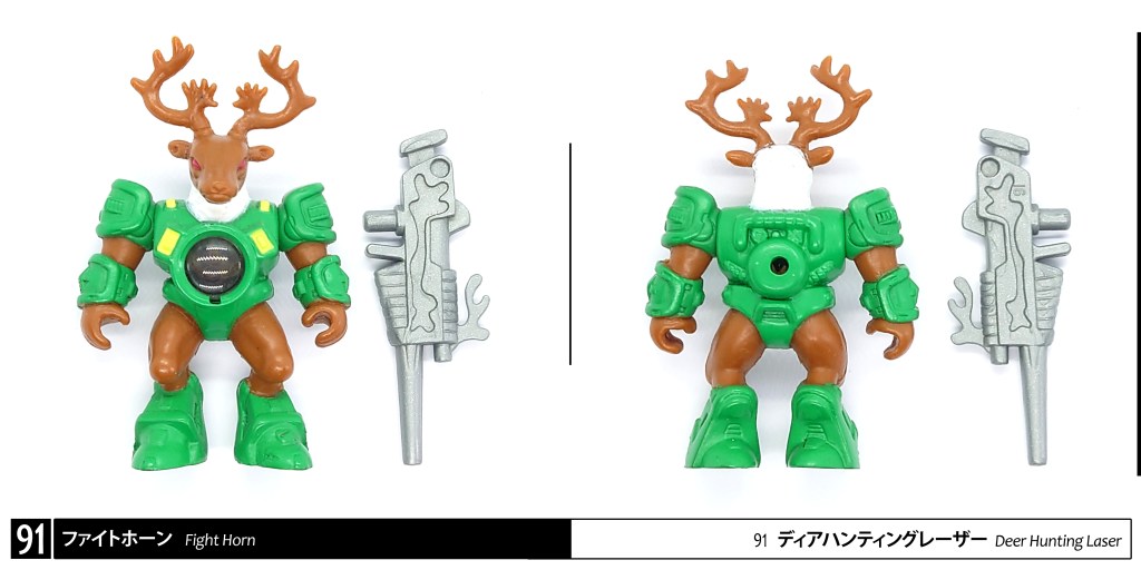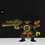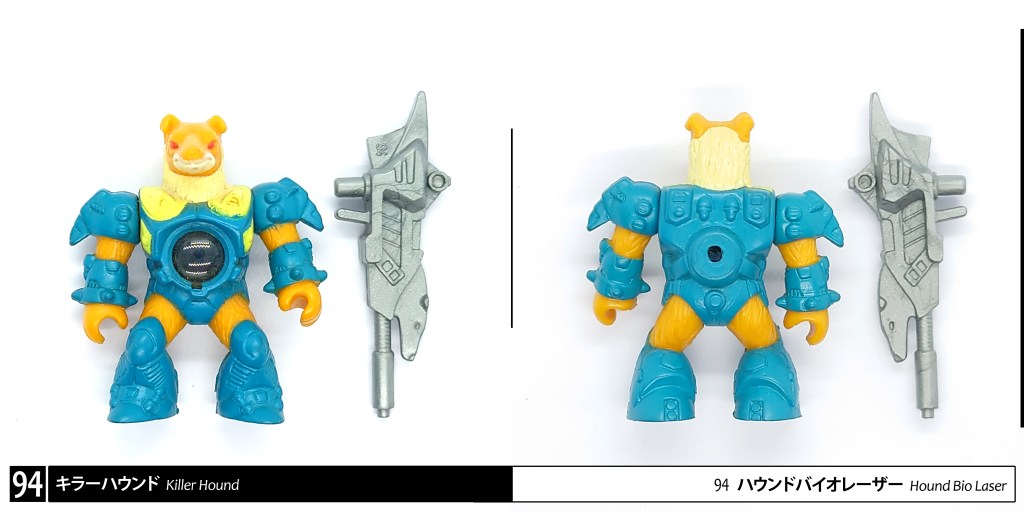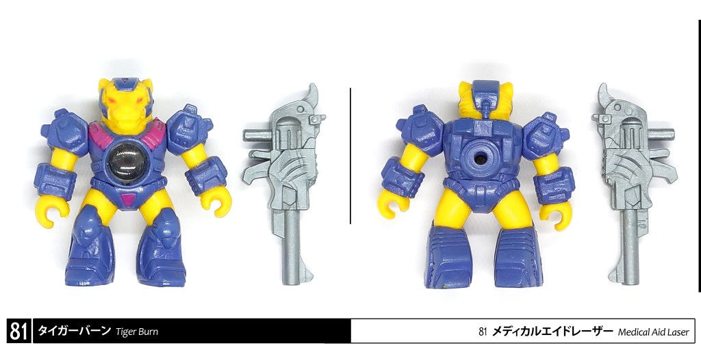 The Fourth series of Battle Beasts got another name due a change in design they became the so called Laser Beasts or Shadow Warriors. A complete series was only available in Japan during the late ’80s. This series contained 36 figures (#77 – #112). To describe the release and rareness of these figures the best way it is the easiest to cut the 36 figures in 3 parts knowing the lower 12 (#77 – #88), the middle 12 (#89 – #100) and the so called 12 high end figures (#101 – #112). The lower 12 were the most widespread of this line because outside Japan they were available in North America and a few European countries. Outside Japan, France was the only other country in the world to welcome the middle 12 figures. Remaining only the last 12 figures that can be seen as Japanese exclusives knowing they were only available in their land of origin, Japan. On these Serie 4 figures the first twelve were marked © Takara 1987 – © 1987 Hasbro  © while the other 24 had the © Takara 1988 – © 1988 Hasbro mark can on their feet, and like the Serie 3 figures also their number is located there which also showed on their weapon. It is possible you will also find a small letter A, B, C on the feet after the number of this figure and this is referring to the production run in which this figure was made because in case a mold would break another one was produced to continue the production. Like the Series 2 and 3 figures also the peg-hole in the bottom of the left foot can be found on the Series 3 figures this was useful to place the figure on some of the vehicles or playsets connected to this line, in this particular case it were the Battle Sleds. In some cases a sticker [中国製] can be found on the bottom of one of the feet. This is referring to the fact of it being a genuine figure from Japan. It literally means; ”Made in China”, which seems a bit ironic but it makes more sense knowing all figures from the Japanese line were produced in China.