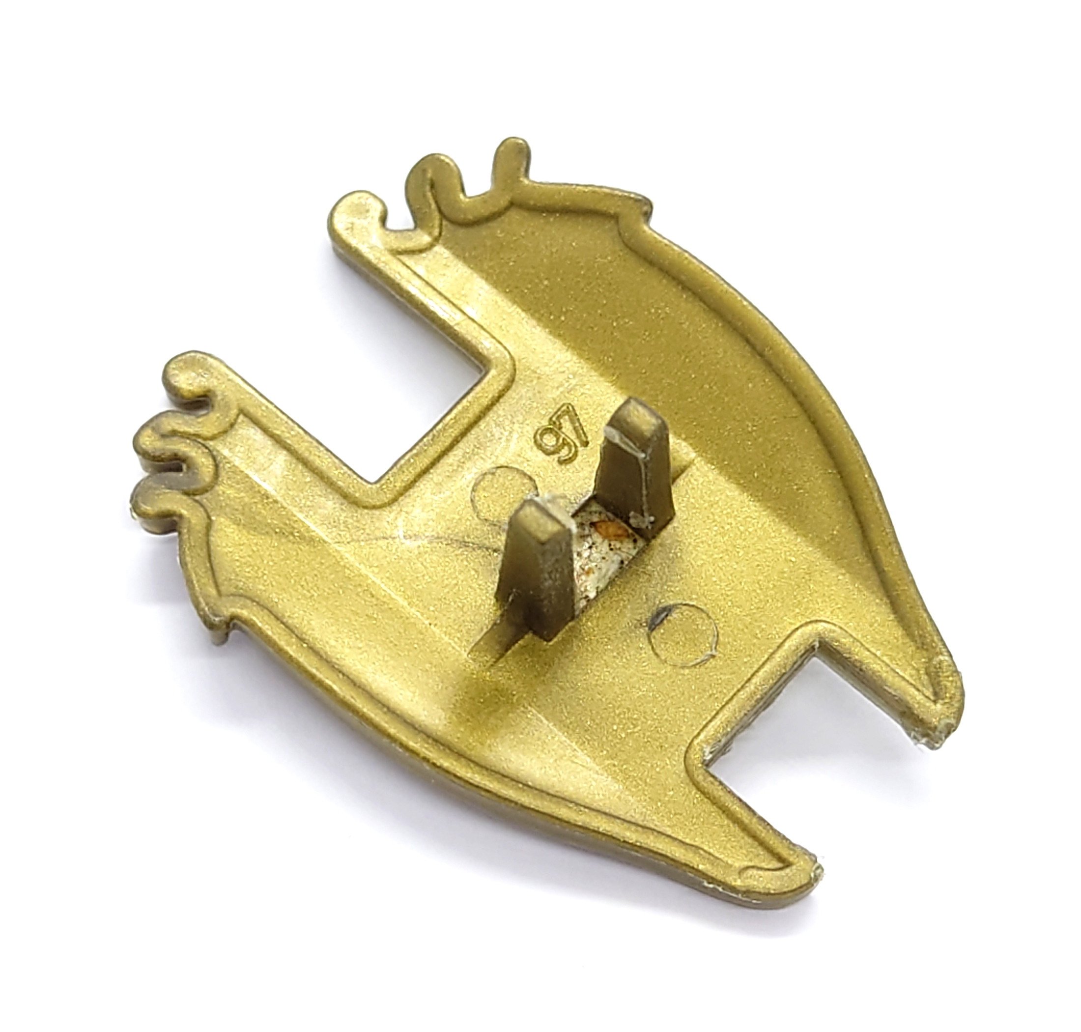 The coat of arm artwork on the front side of the Shield is a sticker. While the Shield itself is nicely decorated around the edges the center piece is indeed JUST a sticker. This does make it look/feel rather cheap while at the same time it makes the Shields (unnecessary) fragile. Even more when you know that there´s a rectangular cut-out area, at the height of where the two pieces of plastic stick out for the connection with the arm, in the plastic of the Shield which makes that the risk of damaging the sticker even higher. Over time a lot of Shields have been found with a damaged, penetrated, sticker. Apart from this issue it´s obvious that the use of a sticker also results in edges that wrap up when they loosen up or eventually a complete let go of the sticker from the Shield. It´s speculation but we would not be surprised if this is one of the reasons why the Shield Battlers didn´t make it to the US knowing the amount of complaints HASBRO has had about the let go of the Battle Beasts rubsigns. You would expect this to have been a lesson learned also knowing that the Orbs for the Laser Beasts could be considered as THE durable solution as replacement for the rubsigns but apparently they forgot about this for the Shields and the use of a sticker was the ¨best¨ solution.