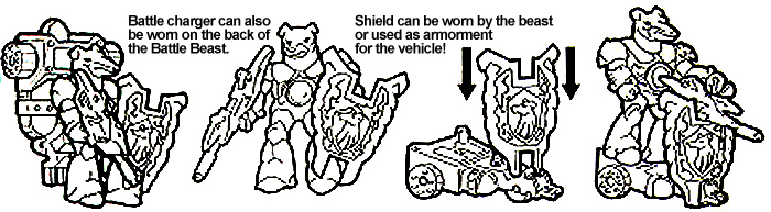 The Battle Charger, a Shield Battler + Sled, is predominantly used as a Battle Chariot/Wagon in which case the Shield is attached to the Sled on the front side and the Laser Beast figure with it´s lasergun are placed on the standing platform safely behind the Shield. But the Sled can also be used as a backpack as the graphic on the packaging shows;