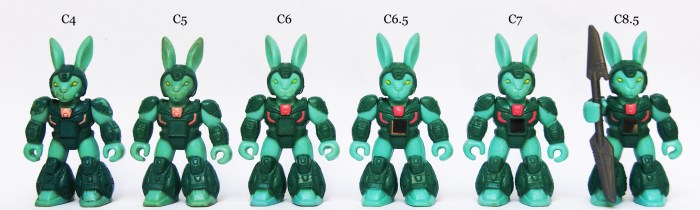 Rabbit 4 (C6.5) could´ve been a C8.5 IF the rubsign would´ve been centered correctly in the original state and it´d have a had a weapon because in the base it´s in better condition than Rabbit 5 (C7). It just shows how minor issues can have a huge influence on the value of original items according to the Beastformers Grading System.